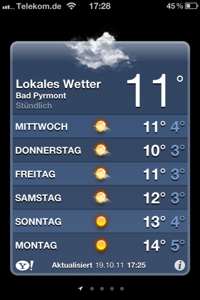 Es wurde aber auch langsam Zeit, dass die vorinstallierte Wetter-App endlich mal Lokal wird und das Wetter in Tagesverlauf anzeigt. Ich habe diese App schlieĂlich Jahre lang mit „rumgeschleppt“ ohne sie De-Installieren zu können. iOS 5 bringt sowiso sehr viele Sinnvolle Funktionen mit sich.