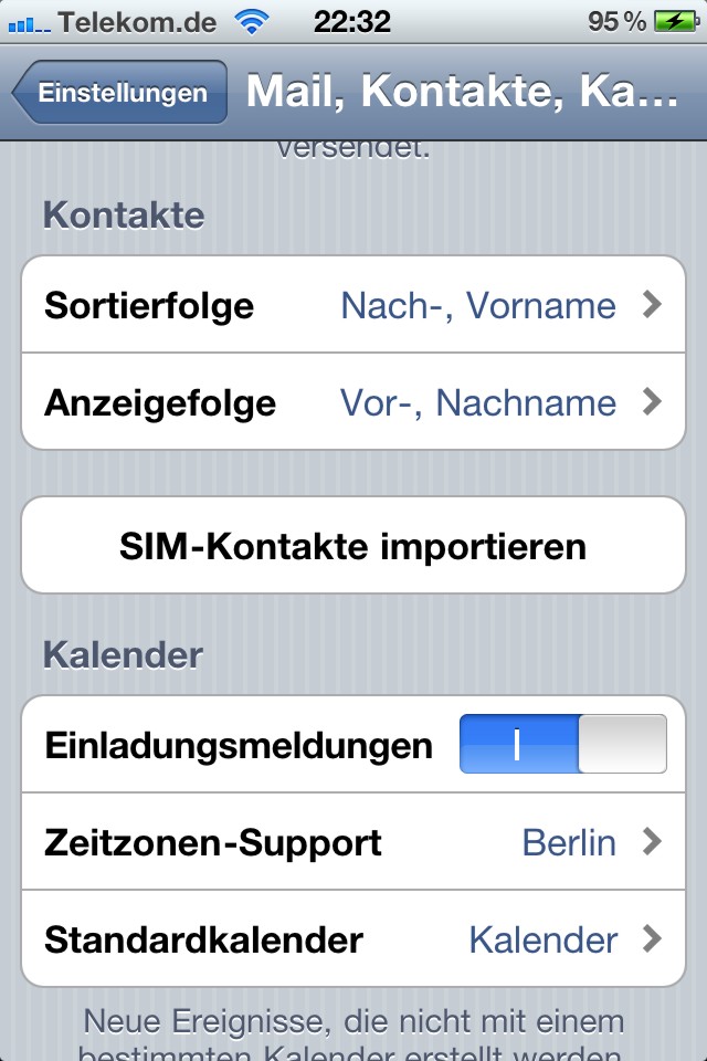 Die entsprechende Option ist im Einstellungsmenü ein wenig versteckt und befindet sich unter Mail, Kontakte und Kalender. Scrollen Sie bis ganz ans Ende der Optionsseite und tippen Sie auf den Schalter „SIM-Kontakte importieren“.
