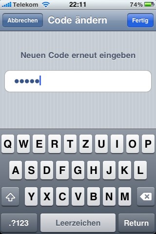 Um die Sache deutlich zu erschweren hat Apple mit dem iOS4 die Möglichkeiten des Codes erweitert. Nun kann man auf die Tastatur zur Eingabe eines Passwortes zurückgreifen. Das Passwort ist dabei nicht auf 4 Stellen begrenzt und darf Buchstaben, Zahlen und auch Sonderzeichen enthalten. Es ist nun möglich deutlich sicherere Passwörter bzw- Codes zu erzeugen, als das vorher der Fall war.